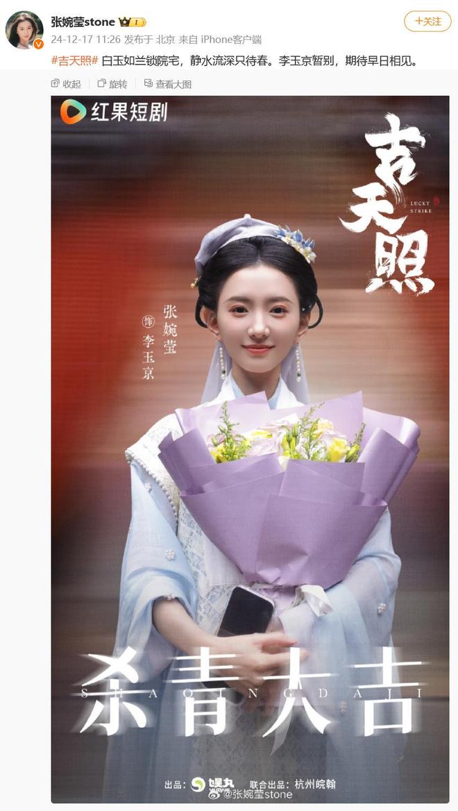 12月17日,张婉莹晒剧照宣布新剧杀青。