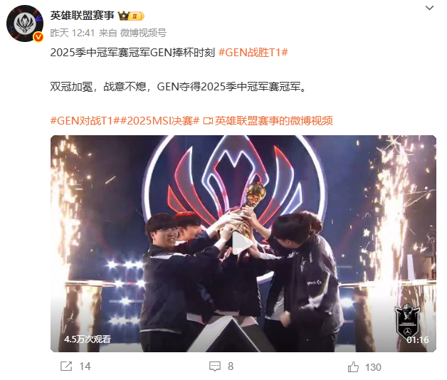 然而,就在同一周,英雄联盟MSI决赛落幕,Gen.G战队以3-2险胜T1,捧起冠军奖杯。这场由拳头游戏主导的赛事,凭借数年的沉淀,依然是电竞迷心中的"圣杯"。