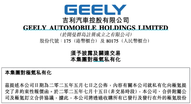 "于2025年7月15日(非交易时段),本公司、合并附属公司及极氪订立合并协议,据此,本公司将透过收购所有已发行及发行在外的极氪股价及极氪美国存托股份(不包括除外极氪股份)进行私有化。"吉利汽车在公告中称。