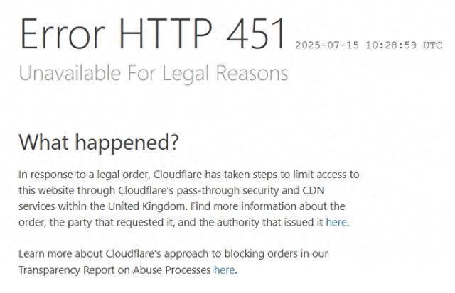 Cloudflare 似乎在英国使用了地理封锁,一些 VPN 用户很快就会发现这一点。正常情况下,使用英国服务器的 VPN 绕过 ISP 封锁的方式与使用世界其他任何地方的服务器并无二致。如果用户尝试使用英国 VPN 服务器访问当前被 Cloudflare 封锁的域名,则会收到 Cloudflare 的错误 451 封锁通知。