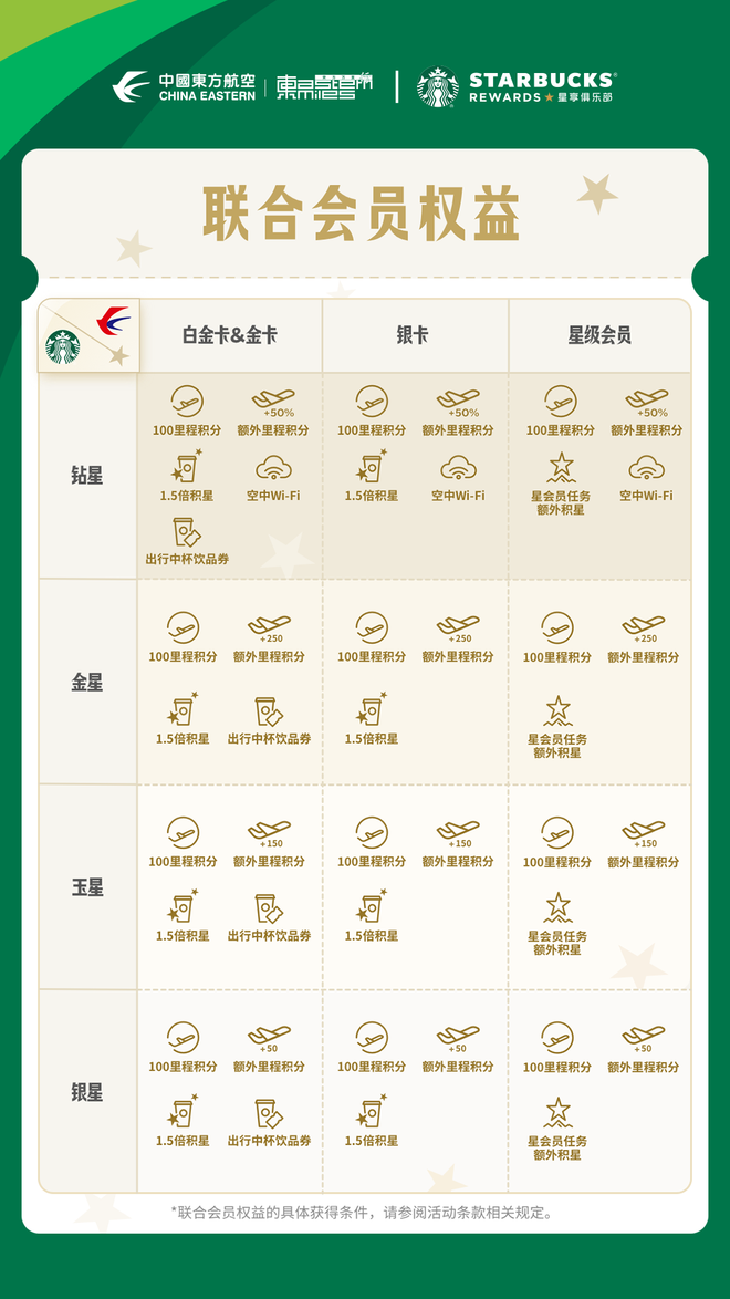 星巴克会员激活联合会员,即可获赠100点东航里程积分;所有东方万里行会员激活联合会员,即可获赠1颗星巴克好礼星星。
