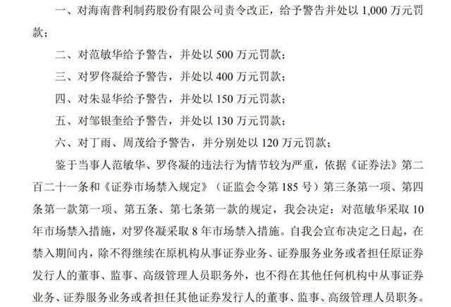 对此,中国证监会对普利制药及其相关责任人进行了处罚。普利制药被责令改正、警告并罚款1000万元。