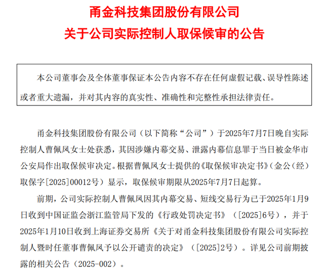 近日,甬金股份发布公告,公司实际控制人曹佩凤因涉嫌内幕交易、泄露内幕信息罪,被金华市公安局作出取保候审决定。
