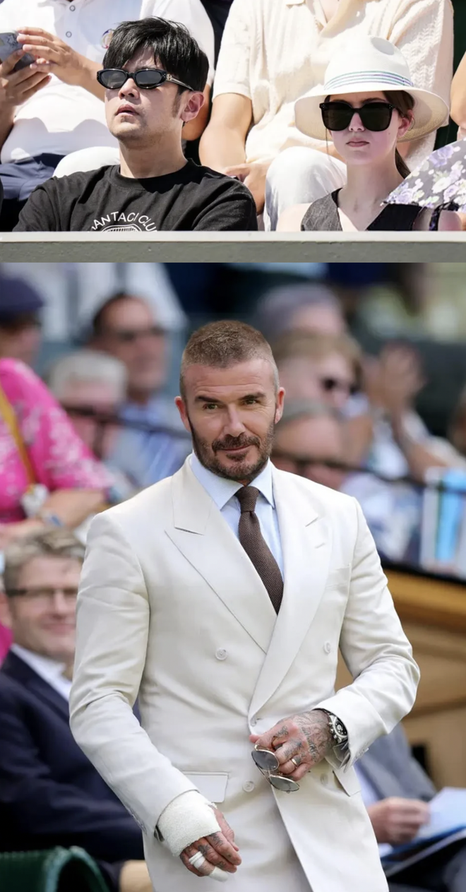 周杰伦和昆凌穿着自家品牌PHANTACi出现在看台,秀恩爱顺便打广告;小贝也是穿上自己操刀设计的BECKHAM x BOSS联名西装,佩戴帝陀手表,外国人有自己的陈欧,我为自己代言;