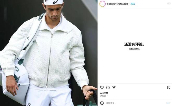 这背的不是包,是100万美元曝光价值。甚至连没进决赛的也能赢时尚版面:Lorenzo Musetti把Bottega Veneta的编织皮夹克穿进了温网,直接在比赛现场官宣成为新晋品牌大使,BV这波也是蹭上了。