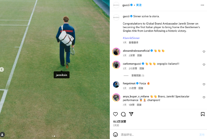 而在男单决赛中,Jannik Sinner则直接上演品牌代言人之间的巅峰对决:Gucci男孩击败LV小将Carlos Alcaraz,把Gucci送进冠军领奖台。