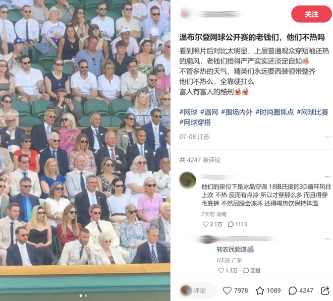 在炎炎夏日,气温高达30度,一些身着全套拉夫劳伦西装的老钱们参加温网比赛,不惧高温,似乎把赛场当作秀场,他们穿着昂贵的西装,似乎并不担心因此捂出热痱子,这种独特的着装选择引发了人们的关注和热议。
