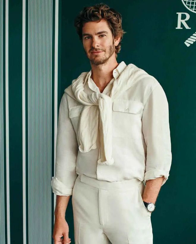 看“蜘蛛侠”安德鲁·加菲尔德就以全白拉夫劳伦造型出场,“复古草地文艺男”的精髓是背上那条白毛衣,虽然不知道后背得捂出多少热痱子,但老钱的精髓是不会出一滴汗的精致优雅,当然一切从容都是空调房给的。