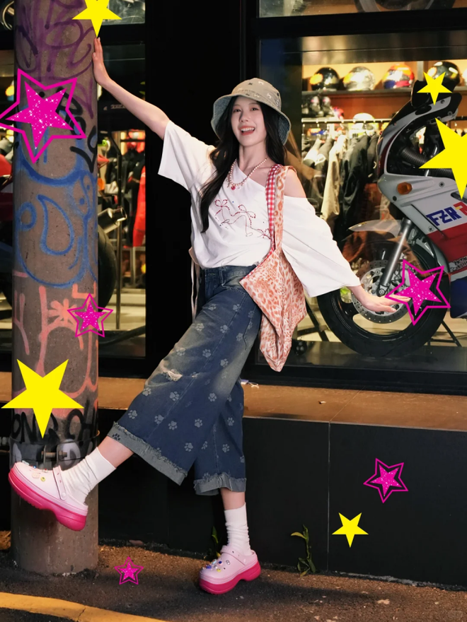 洞洞鞋总被说丑,Crocs就加上了厚底和其他设计元素,让它变得更适合日常时尚穿搭。好比今年2月重磅回归的小鲸鱼洞洞鞋,和近期的两款新品“堆堆”和“珊瑚”,分别能当老爹鞋、松糕鞋、潮鞋,明星都穿它们搭造型。