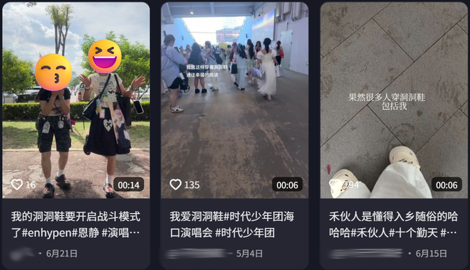 鞋面上的洞洞更是堪称外挂。露天音乐节遇上点刮风下雨的,别的鞋沾泥灌水,洞洞鞋甩甩就速干;心灵手巧的粉丝还会给洞洞装上和自家爱豆相关的鞋花,做“痛鞋”,易如反掌。