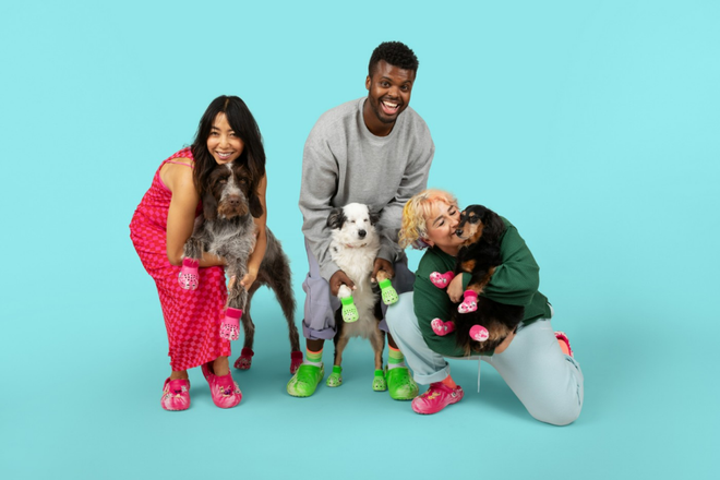 光是照顾洞门人的各种需求还不够,2024年10月,Crocs打入宠物市场,推出有史莱姆绿和火龙果红两种配色的宠物洞洞鞋,鞋口配有同色魔术贴设计,确保贴合小狗的脚。一同推出的还有同色系成人款洞洞鞋,以及小狗鞋花,狗奴猫奴们实在很难抗拒这么一套“亲子装”。