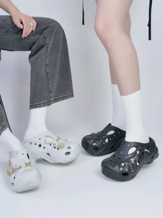 “洞洞鞋+智必星”的黄金组合就此风靡,直到今天,年轻人依然沉浸在鞋花艺术里:去海滩装贝壳和珍珠,去livehouse装金属朋克五件套,出门探店装贝果和法棍,哪怕是围观万圣节变装大会,都有3D假脚趾这样天造地设的鞋花。