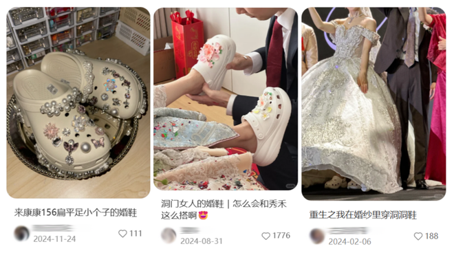 乍一听离谱,仔细想想发现太合理了。毕竟结婚太累了,新娘子凌晨就得起来做妆发,接亲、招待、仪式、敬酒,踩着尖头高跟鞋折腾一天无异于上刑,只有洞洞鞋能带来“暴走2万步虎虎生风,伴娘和摄影师都追不上我”的体验。