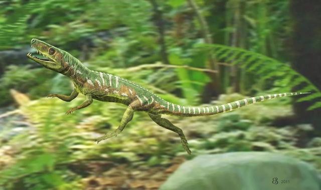 Euparkeria capensis,一种体长60厘米的小型爬行动物,生活在早三叠纪(2.45亿至2.37亿年前)。图片来源:Taenadoman,2011年