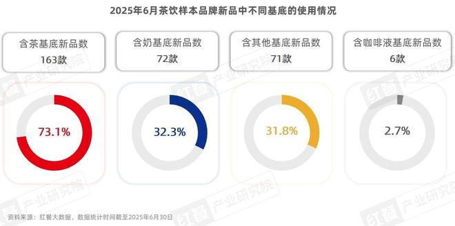从茶饮类和咖啡类新品使用的基底来看,茶饮样本品牌推出的新品中,含茶基底的新品数有163款,占比为73.1%,相较5月,数量有所下降,占比则提升了4.5个百分点;所有新品中,有72款新品含有奶基底,占所有总数的32.3%,相较于5月,数量和占比均有所下降;所有新品中有71款新品使用了其他基底,占比达31.8%,与5月相比,数量和占比均有小幅增长。