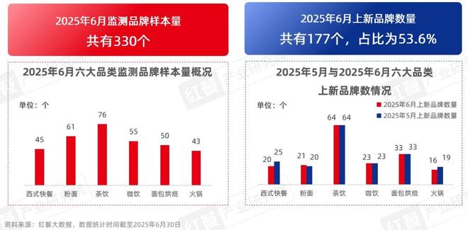为洞悉餐饮行业产品上新发展趋势,红餐产业研究院选取了餐饮行业具有代表性的六个品类作为监测对象,包括西式快餐、粉面、茶饮、咖饮、面包烘焙、火锅这六大品类。在2025年6月,红餐产业研究院监测的六大品类的品牌样本量一共有330个,总计有177个品牌推出新品,占监测品牌样本量的53.6%。