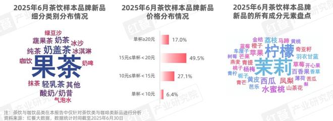 从价格分布来看,6月茶饮新品价格主要集中在15元≤单杯<20元和10元≤单杯<15元两个区间内,占比分别为49.5%和27.1%,而10元以下和20元及以上区间的新品则相对较少,占比分别为6.4%和17%。