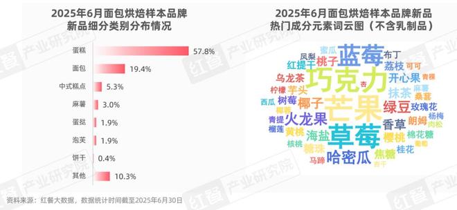 2025年6月,在红餐产业研究院监测的面包烘焙品牌中,有33个面包烘焙品牌共推出了263款新品。从面包烘焙品类新品的细分种类来看,蛋糕类新品数量最多,共推出了152款,占新品总数的57.8%。其次是面包类,共上架51款新品,占新品总数的19.4%。其他类则有27款新品,占新品总数的10.3%。