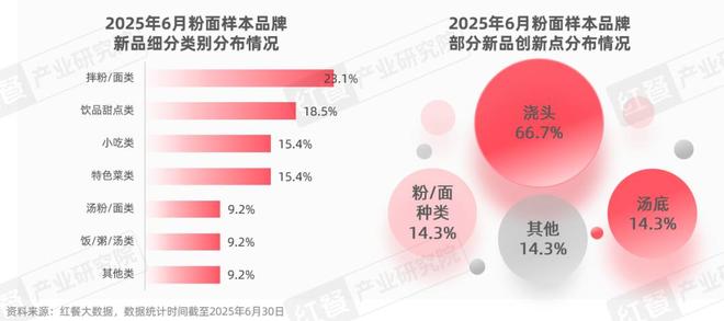 2025年6月,在红餐产业研究院监测的61个粉面品牌中,有21个品牌共推出了65款新品,当月粉面新品涵盖的类别有拌粉/面类、饮品甜点类、小吃类、特色菜类、汤粉/面类和饭/粥/汤类。