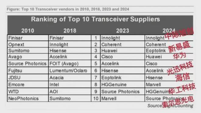 近期,国际知名光通信行业研究机构LightCounting最新发布的2024年全球光模块TOP10榜单显示,中国厂商占据7个席位,已在该领域占据主导地位。在全球范围内新易盛排名第3,在中国范围内新易盛排名第2。而在2023年,新易盛还只处在全球第7,中国第5的位置,仅用一年时间,新易盛就超过了华为、光迅科技、海信等实力企业。