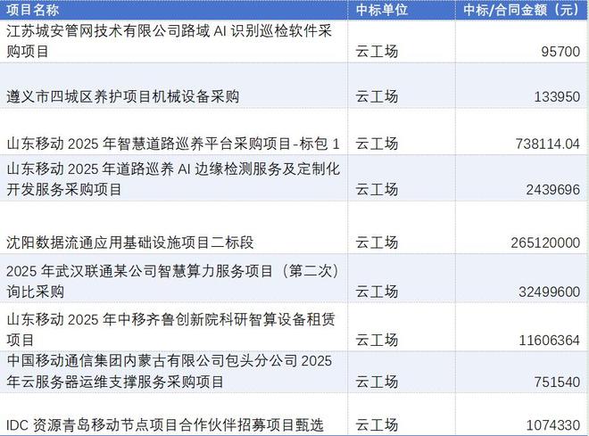 具体来看,这些中标项目涵盖了AIOT(人工智能物联网)、算力服务、云服务器运维支撑服务及IDC资源等多个领域。