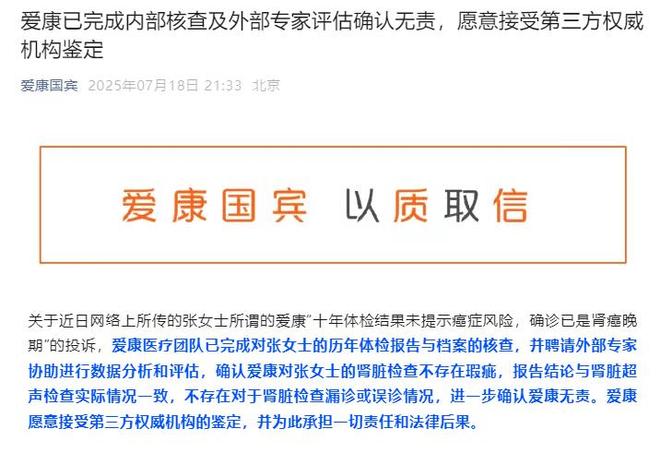 7月18日晚9点左右,爱康国宾再一次发布了有关近期"真假体检"投诉一事的声明,在这份声明中,爱康国宾表示:爱康经过内部医疗团队紧急调查及外聘专家的第三方核查,确认爱康在对张女士的肾脏的检查中,不存在漏诊或误诊情况,更不存在张女士所称"假体检"。爱康完整保留了张女士肾脏超声检查的影像图片文件,只要张女士同意,爱康可以马上公开张女士的超声检查影像图片,公开透明,接受医疗专业人士以及公众的审核。