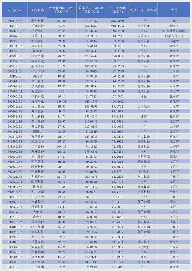 具体而言,胜宏科技(300476.SZ)、长盛轴承(300718.SZ)、福达股份(603166.SH)、内蒙一机(600967.SH)、龙溪股份(600592.SH)、美力科技(300611.SZ)、雷迪克(300652.SZ)、中大力德(002896.SZ)、杭齿前进(601177.SH)、浙江荣泰(603119.SH)、华培动力(603121.SH)、利元亨(688499.SH)、恒工精密(301261.SZ)、汉威科技(300007.SZ)、万达轴承(920002.BJ)、中航泰达(836263.BJ)、涛涛车业(301345.SZ)等17只个股成功实现翻倍。