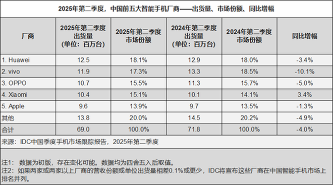 今日,IDC中国发布了2025年第二季度中国智能手机出货量报告,并公布了中国前五大手机厂商的市场排名。数据显示,第二季度中国智能手机市场出货量为6896万部,同比下降了4.0%。这一数据标志着市场结束了连续六个季度的同比增长,并呈现出一定的下滑趋势。