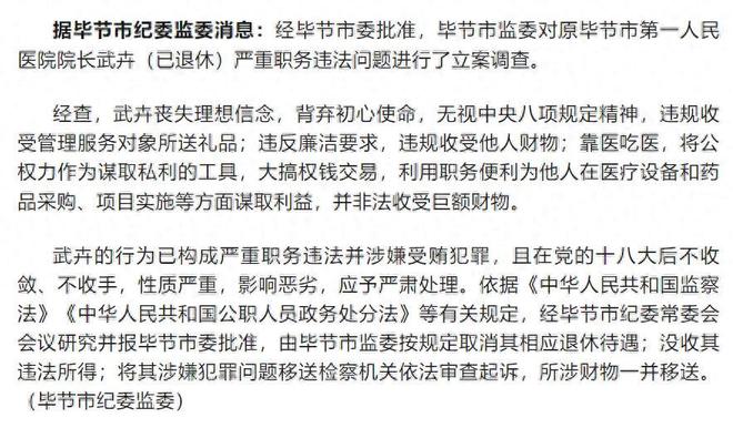 经毕节市委批准,毕节市监委对原毕节市第一人民医院院长武卉(已退休)严重职务违法问题进行了立案调查。