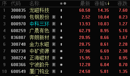 7月24日,稀土永磁概念早盘走强,北方稀土开盘后快速拉升,中科三环9:38封住涨停,金力永磁、银河磁体、宁波韵升等多只个股跟涨。