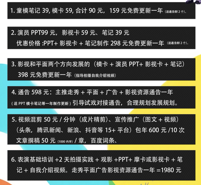 在上述家长采访中,儿童演员经纪人在演员和剧组之间充当了一个重要的沟通角色。麻辣科技记者以家长身份联系到山东一家演艺公司,经纪人聂洋表示,公司提供多种经纪合约,家长可以根据需求选择,他推荐称,多数家长选择598元套餐,包含一年的"走秀+平面+广告+影视资源通告",引导试戏、对接通告,合理规划发展,并送模卡、个人介绍PPT制作。