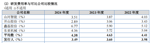 2022年度、2023年度和2024年度,志高机械研发费用分别为3,164.97万元、3,021.60万元和3,099.75万元,占当期营业收入的比例分别为3.98%、3.60%和3.49%,呈现下滑趋势。相较之下,同期同行业可比公司研发费用率均值分别为4.40%、4.63%和4.38%。