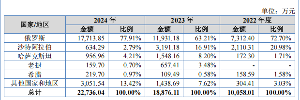 从外销国别来看,俄罗斯市场占据了至关重要的位置,不仅销售收入最高且增速最快,短短三年内出口额就从7,312万元增长至17,714万元。2022年度、2023年度和2024年度,这一地区的销售金额占外销收入的比例分别为72.70%、63.21%、77.91%。