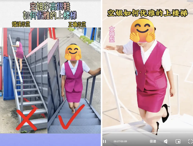 在一些“空乘礼仪学院”的教学守则里,高跟鞋意味着优雅、“女神范”,穿高跟鞋上登机梯的姿势尤其需要重点学习。