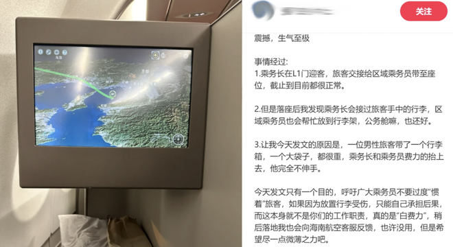 民航局《客舱运行管理》规定,除老弱病残外,旅客需自行摆放行李至行李架。空乘没有帮旅客放行李的义务,但“规定只给空乘看,又不给乘客看。”
