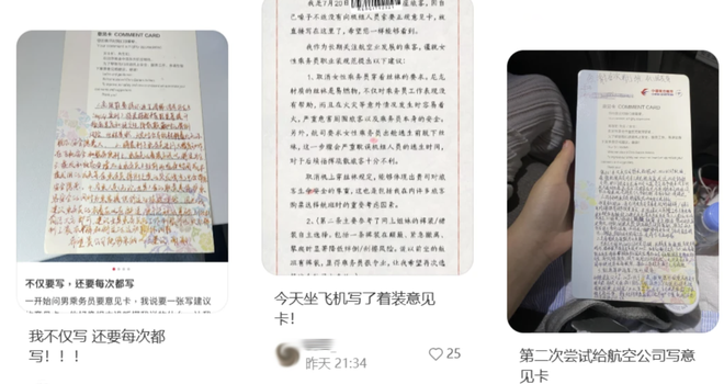 4月,有网友把自己写的“取消强制要求女性空乘穿高跟鞋”意见卡分享在社交媒体上,引发大量效仿,“不仅写,还要每次坐飞机都写”。