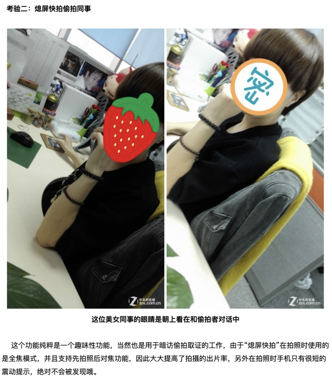 2014年,有自媒体曾评测“华为荣耀6熄屏快拍六重考验”,包括“熄屏快拍偷拍同事”(图源:中关村在线)