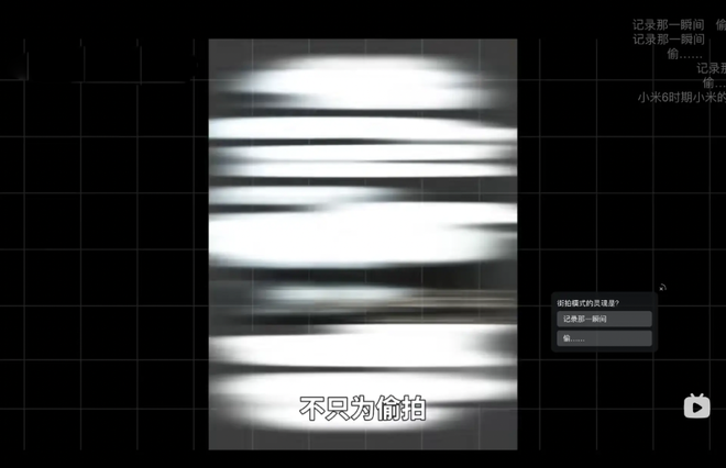 随后,视频蹦出一个二选一的浮窗:“街拍模式的灵魂是?”一个选项是“记录那一瞬间”,而另一个选项是“偷……”。