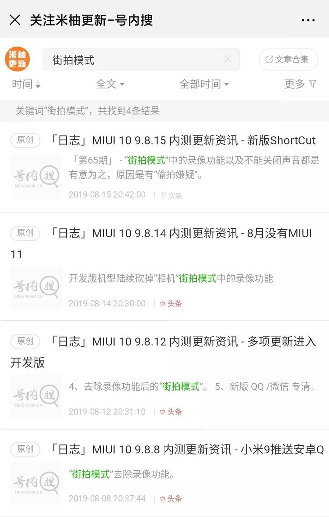 另外,从2019年推出的MIUI 11系统开始,小米出于用户反馈和隐私安全考虑,为“街拍模式”增加了快门声音,即使用街拍模式拍摄时也会保留较为明显的相机声音效果,同时还取消了该模式下的录像功能。