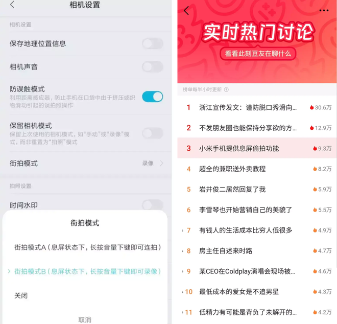 7月18日,小米手机被曝搭载的“街拍模式”功能疑似在熄屏状态下,可长按音量下键用于连拍或录像。用户质疑,该功能可能会被用于偷拍,从而在社交媒体上引发广泛的隐私安全争议,并登上豆瓣实时热门讨论第三名。