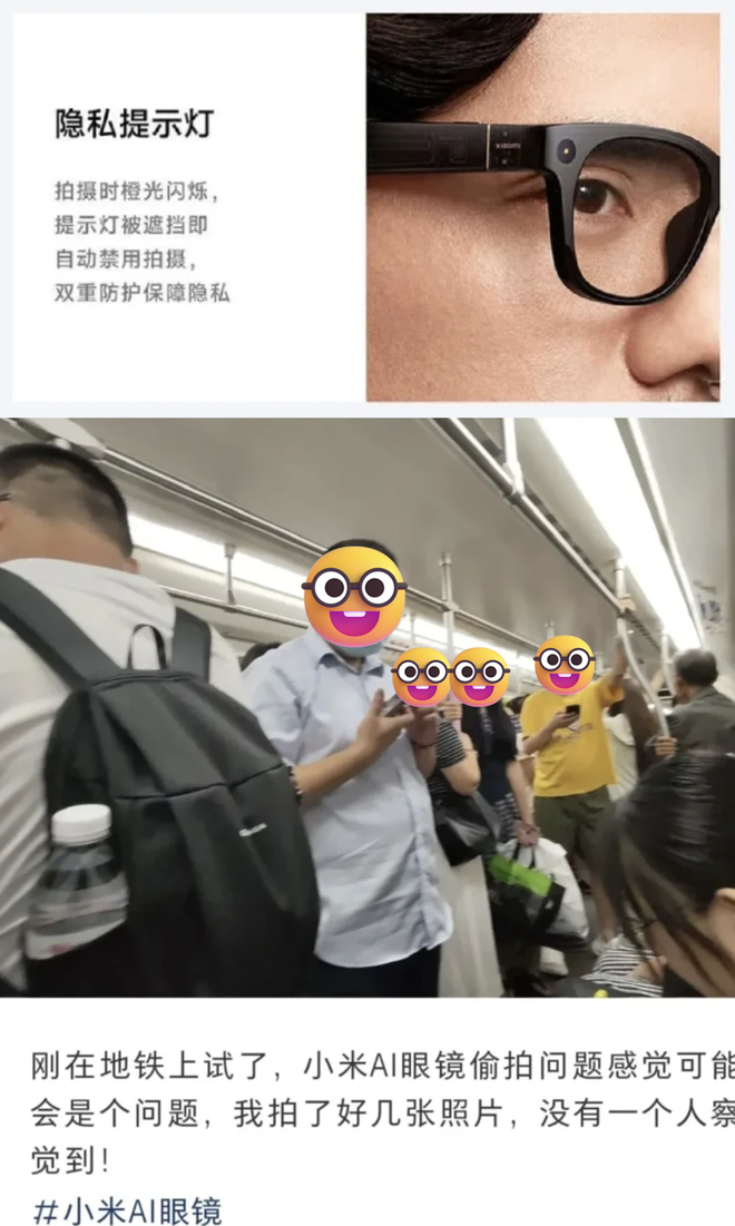 而前段时间小米AI眼镜也陷入了新的偷拍争议之中。和第二代谷歌眼镜的设计类似,它安装了“拍摄时会闪烁”的隐私提示灯,且提示灯被遮挡时会停止拍摄。不过,据财联社报道,有博主特意戴上该款产品乘坐早高峰地铁,发现虽然拍摄时眼镜有亮灯提醒,但并没有人注意到自己正在被拍;另外有博主测评指出,该款产品的摄影提示灯与其它智能眼镜产品相比,尺寸较小、亮度较低,在光线充足的时候难以识别其正在拍摄。