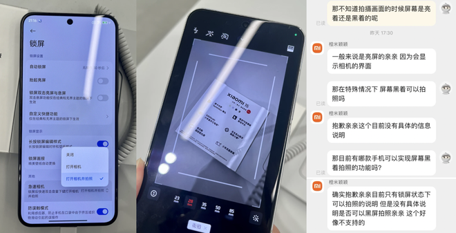 据编辑线下体验店实测和线上客服咨询,再次确认了,新推出的小米15仅保留有锁屏时快速唤起相机的功能,从相机唤起到拍摄过程中均保持亮屏状态,目前没有机型支持黑屏状态下的静音拍摄。