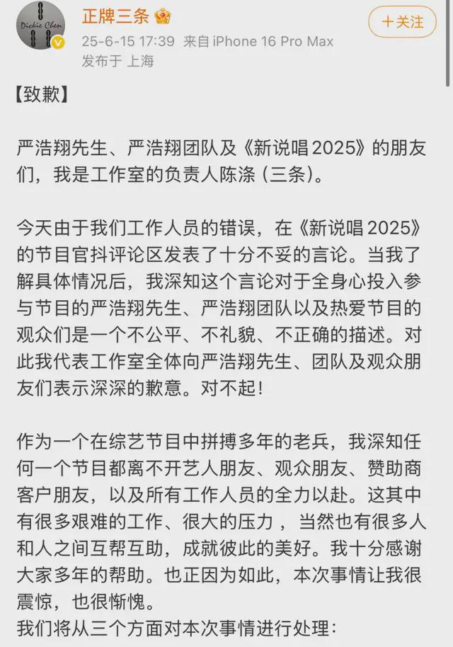 当日上午,《新说唱2025》这档综艺的官方短视频账号,在艺人严浩翔相关视频评论区发布了贬损性言论——"粉丝还是差点,这赞还是没有邓典果多,不给力"。节目组最初解释这是"实习新人误操作",但被发现此账号是由3人共同运营,未能服众。