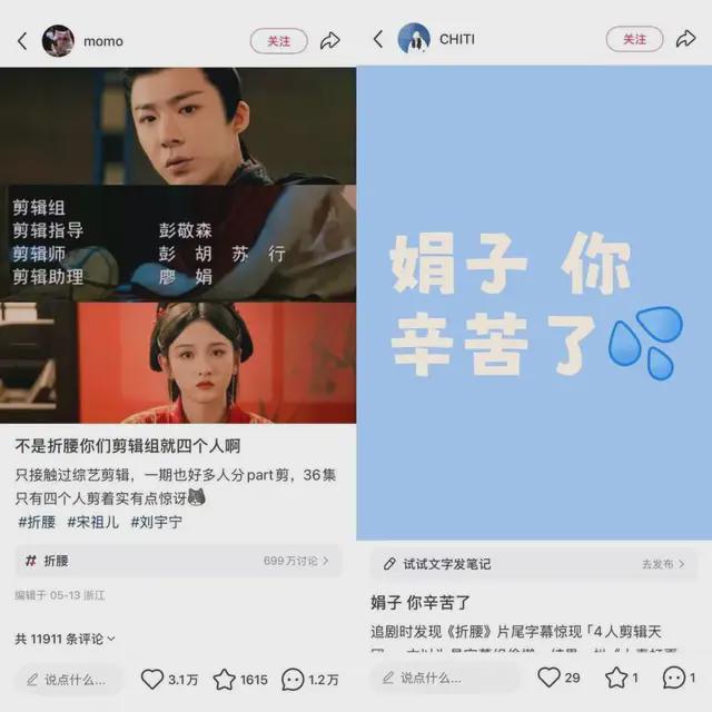 在这之前,《折腰》的"牛马剪辑助理廖娟"也曾在小红书引爆话题。