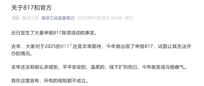 “盗墓笔记”作者南派三叔(徐磊)近日连发多条声明,痛批部分粉丝饭圈化、举报817稻米节活动、左右舆论走向。