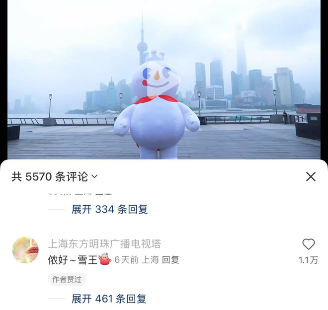 而在雪王发布的外滩视频评论区,东方明珠也做出友好回应,某种程度上可以看作是蜜雪冰城与上海互相联动的信号。