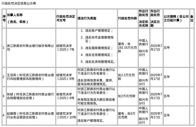 麻辣新闻7月31日讯,近日,中国人民银行绍兴市分行发布了罚单,剑指浙江新昌农村商业银行股份有限公司及其相关责任人。
