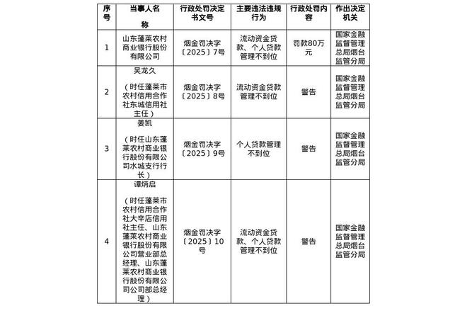 罚单显示,山东蓬莱农村商业银行股份有限公司的主要违法违规事实为:流动资金贷款、个人贷款管理不到位。针对上述行为,该行被罚款80万元。