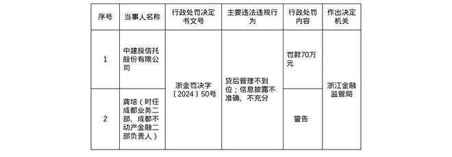 针对上述行为,国家金融监督管理总局浙江监管分局对中建投信托罚款70万元。此外,时任成都业务二部、成都不动产金融二部负责人龚培,因对以上事项负有责任,被警告。![]()