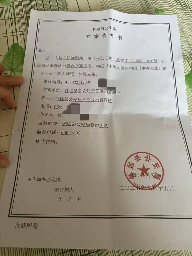 据崔某庆家属提供的立案告知书显示,7月15日,怀远县警方已对“崔某庆被非法拘禁”立案调查。